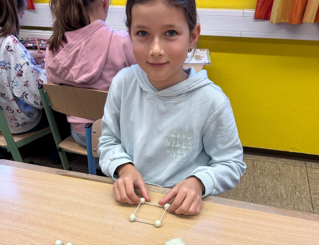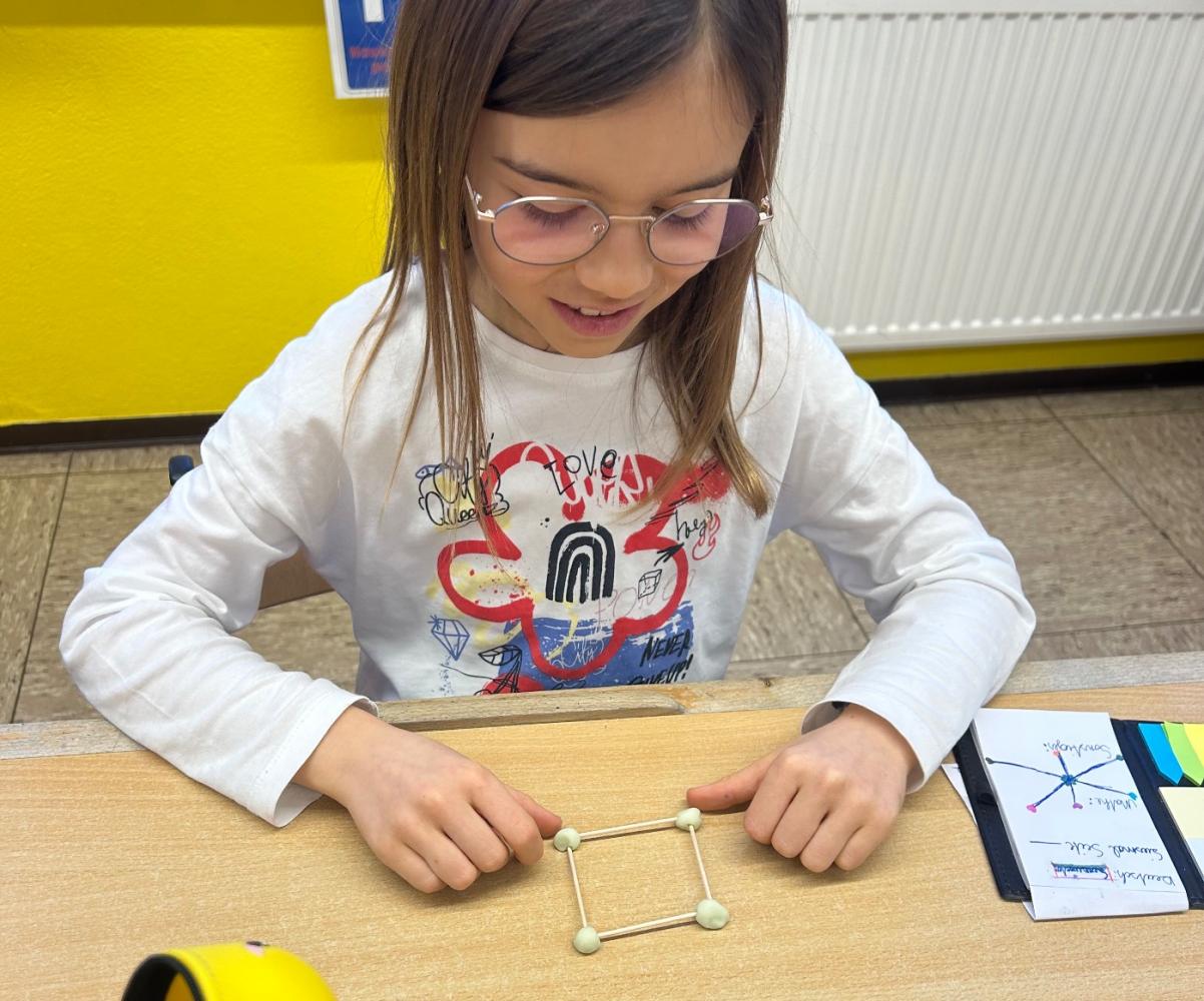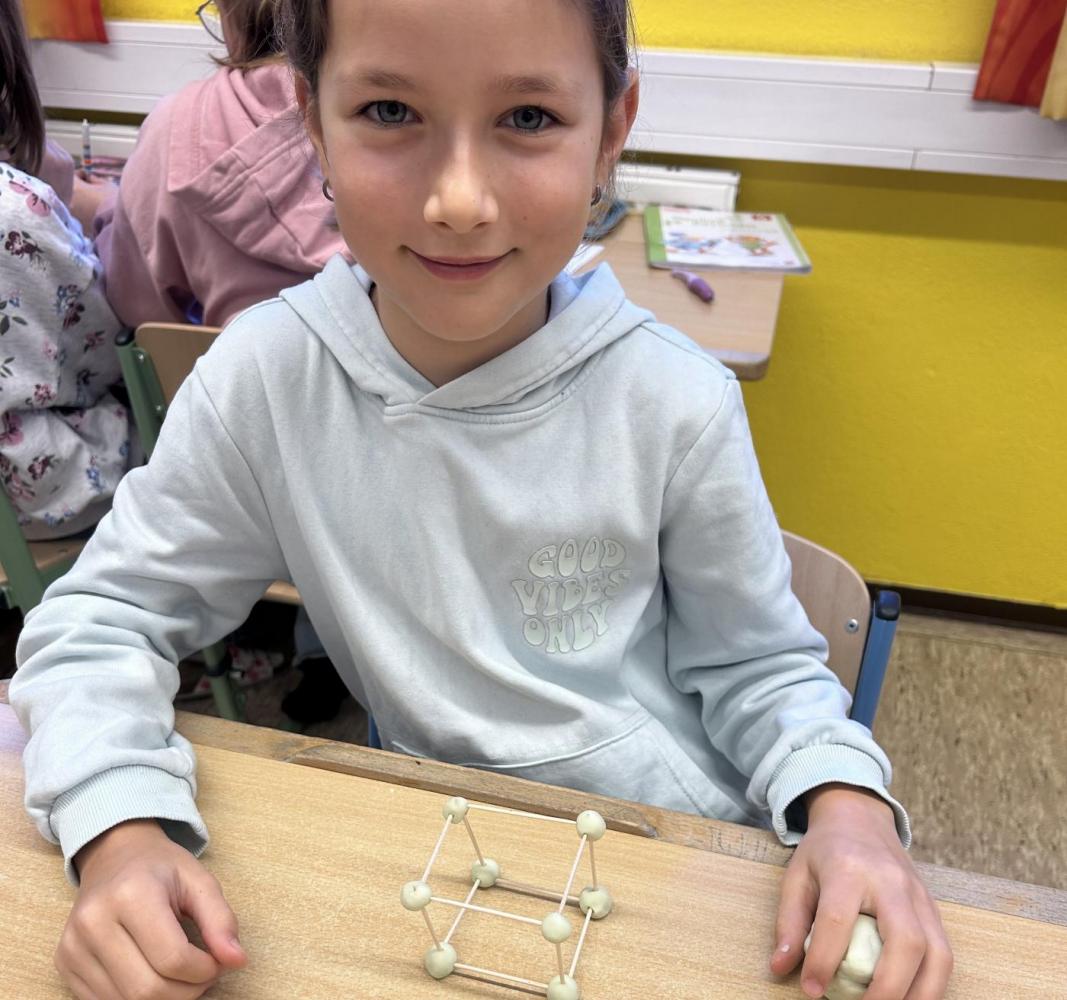 Nachdem die geometrischen Körper im Unterricht ausführlich behandelt und gemeinsam entdeckt worden waren, erhielten die Kinder die Möglichkeit, ihr Wissen auf kreative Weise zu vertiefen. Mit Knete, Holzstäbchen und Papier gestalteten sie verschiedene Formen wie Würfel – und jedes entstandene Werk war ein kleines Kunststück.