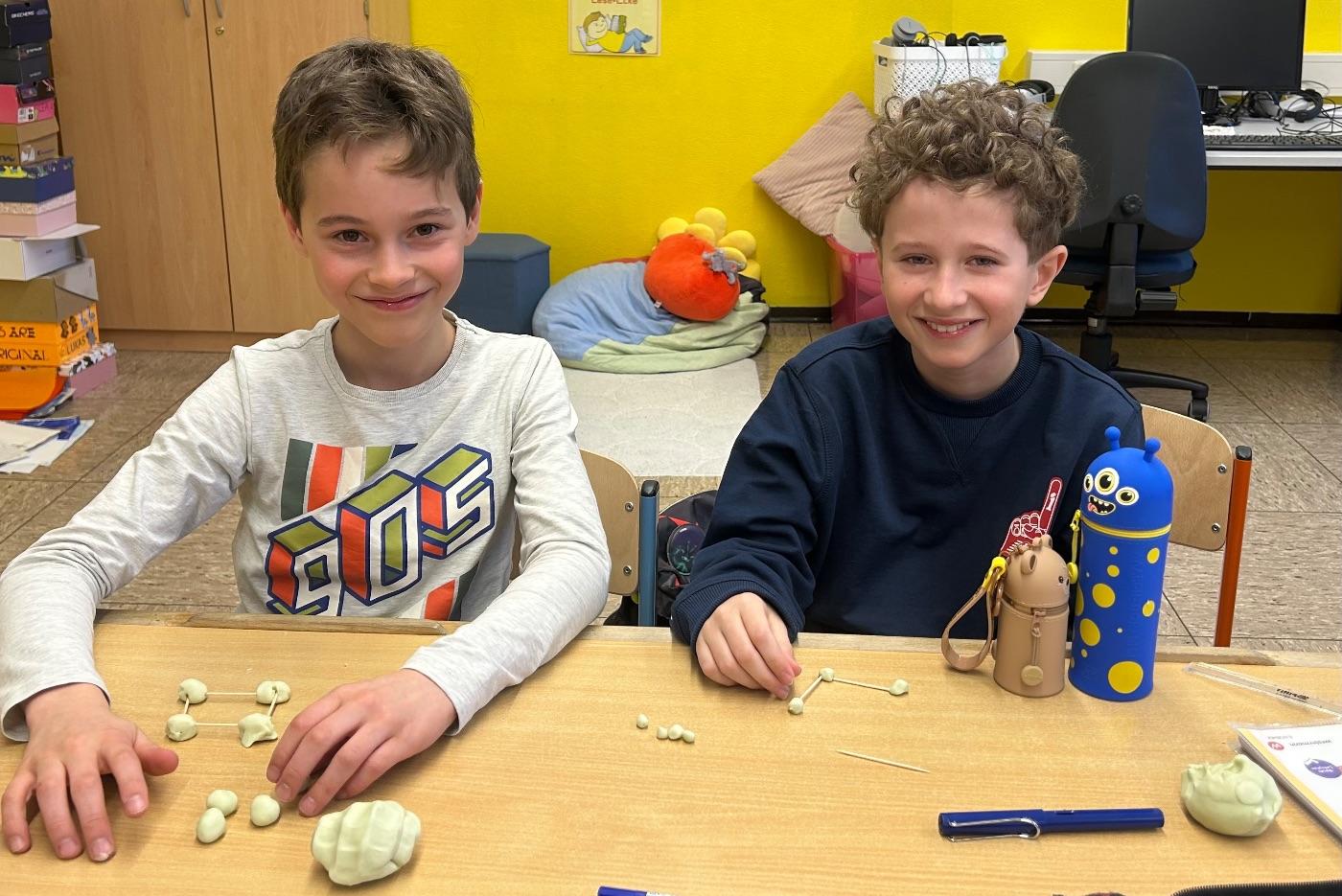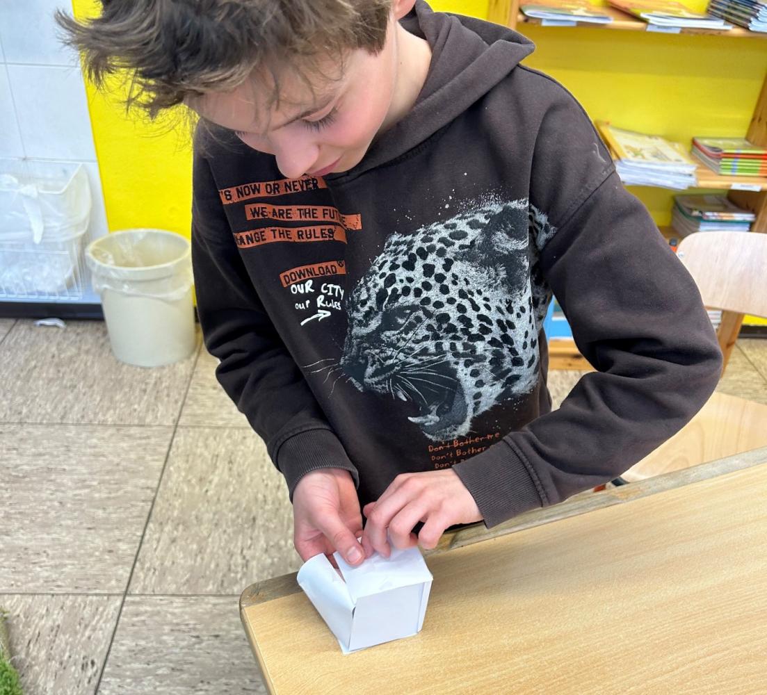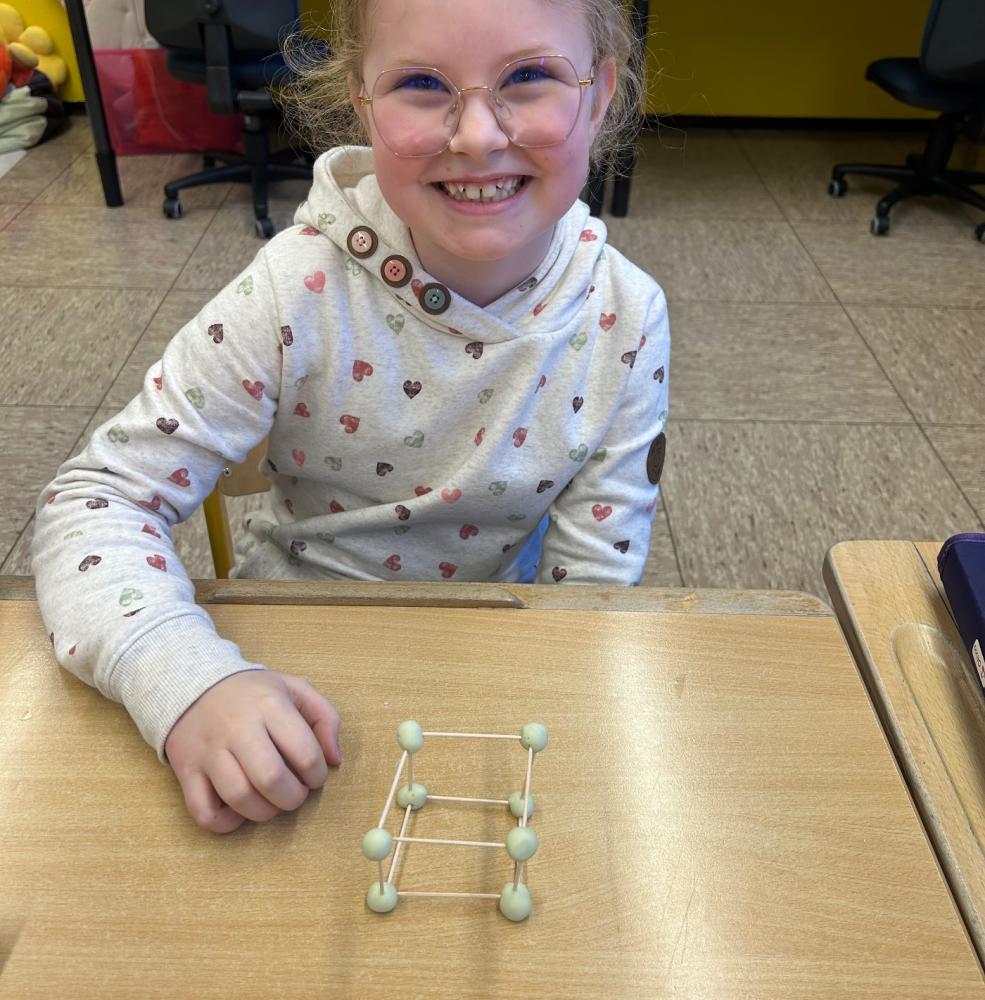 Nachdem die geometrischen Körper im Unterricht ausführlich behandelt und gemeinsam entdeckt worden waren, erhielten die Kinder die Möglichkeit, ihr Wissen auf kreative Weise zu vertiefen. Mit Knete, Holzstäbchen und Papier gestalteten sie verschiedene Formen wie Würfel – und jedes entstandene Werk war ein kleines Kunststück.